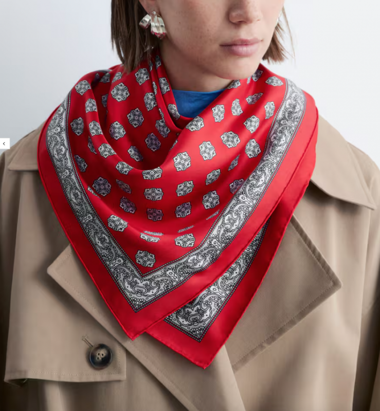 Große Quarrées sind momentan sehr modern. Sie kommen vielfältig zum Einsatz, man trägt sie um den Hals, als Dreieck um die Taille geschlungen, durch die Gürtelschlaufen der Jeans gezogen, an die Handtasche gebunden oder auf dem Kopf als Statement. Am schönsten fallen die Tücher aus Seide, wie dieses von otherstories in kräftigem Rot.